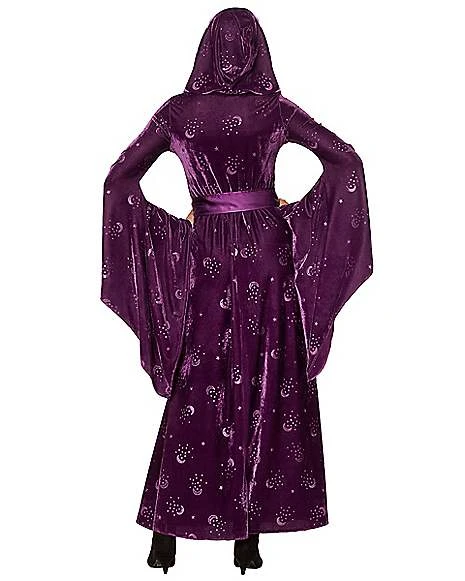 Add this velvet celestial robe to your Halloween costume and you’ll be ready to cast some spells. This velvet robe features moon and star print detail that will have you standing out in every crowd you enter. With long bell sleeves and an attached hood, this velvet robe is a must have for every spellbound costume.