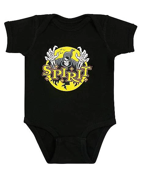 Make your little one look like the ultimate Spirit Halloween fan with this Spirit Halloween One Piece Suit. This awesome one piece suit features the official Spirit Halloween mascot on it and will make them a Spirit fan for life.Â